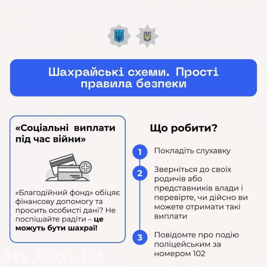 «Доброго дня, вам нарахована грошова допомога. Для її отримання вкажіть свої паспортні дані, номер картки, термін її дії та код, зазначений на звороті», – такий дзвінок ви можете отримати від шахраїв . «Соціальні виплати під час війни» – одна з найпоширеніших схем шахрайства.