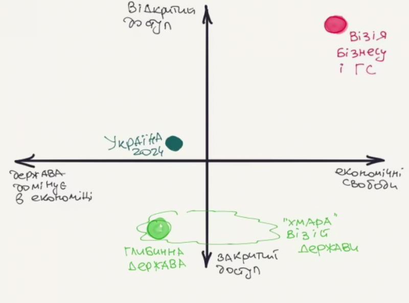 Є і ліберальна держава реформ, прогресу, цифровізації, сервісів, децентралізації, прозорості. Вона захоплює нові сфери, але при цьому обидві глибинні держави слідом заходять на створену нову територію, бюрократизують її і будують нові схеми "поверх" свобод (реформа електронних державних закупівель, корпоративного управління, БЕБ тощо).