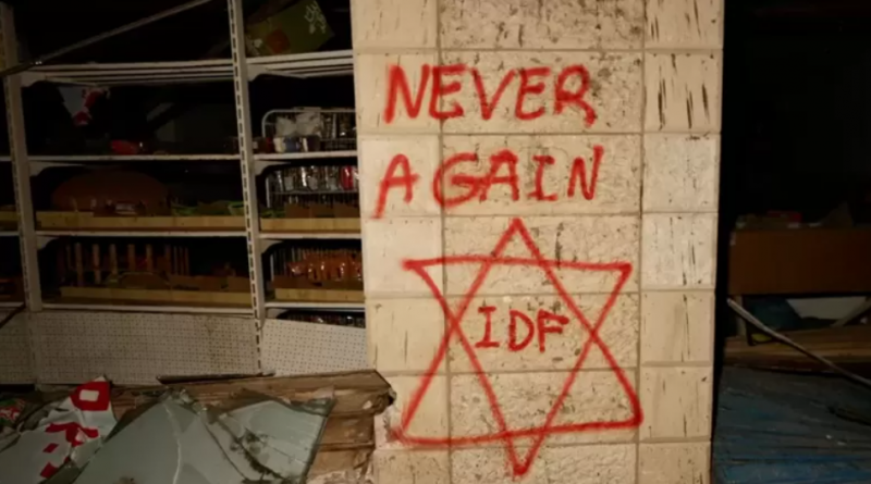 На стіні червоною фарбою з балончика намальована зірка Давида, всередині неї хтось написав "ЦАХАЛ", а над нею — слова: "Ніколи знову".