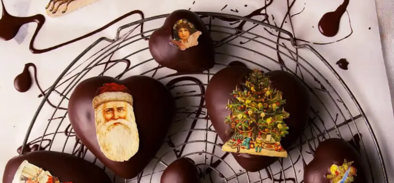 Візьміть дві жаростійкі миски і розламайте в кожну з них окремо чорний і білий шоколад. Доведіть каструлю з водою до кипіння, поставте одну з мисок над легкими бульбашками води і розтопіть шоколад. Темним шоколадом полийте печиво у формі зірочок, потім повторіть процедуру з білим шоколадом і покрийте ним печиво у формі сердечок та прикрасьте його зацукрованою апельсиновою цедрою та маком.