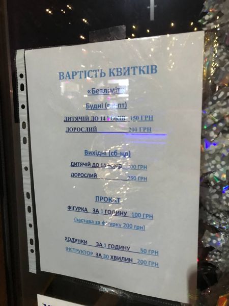 - Квиток для дорослих у будній день коштує 200 грн, для дітей — 150 грн, у вихідні дні 250 і 200 відповідно. Ціни намагаємося тримати, не зважаючи на те, що тарифи на електроенергію значно підвищилися. На жаль, нам не надають пільги на електроенергію, а каток — це дуже енергозатратний об’єкт. А треба ж ще і персоналу достойну зарплату платити, і бензин купувати для машини, яка чистить лід.