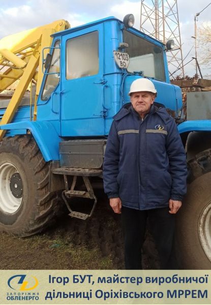 Ігор Бут від перших днів повномасштабної війни щодня виходить на лінію та відновлює зруйновані рашистськими снарядами електромережі. Зізнається, часто доводилося потрапляти під ворожі обстріли, бо Оріхівщина – по-справжньому прифронтова територія, куди «дістають» і авіабомби, і артилерія.