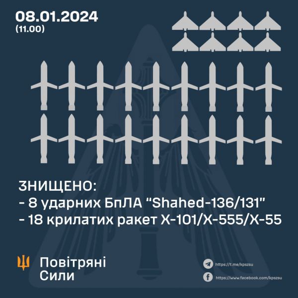 Как сообщило Командование Воздушных Сил ВСУ, в ночь на 8 января 2024 года противник нанес массированный удар по Украине, применив крылатые, авиационные, баллистические, зенитные управляемые ракеты и ударные БПЛА.