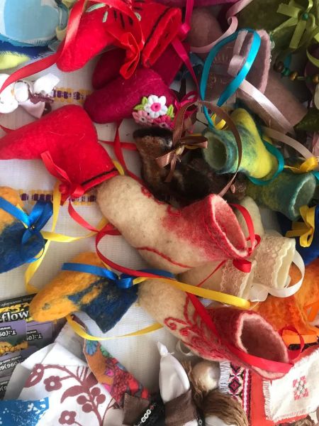Роботи усі дуже різні, кожна майстриня має свій неповторний стиль виготовлення цих оберегових іграшок. А Марина Широкова представила яскраві віночки і оригінальні невеличкі валяночки - парний оберіг.