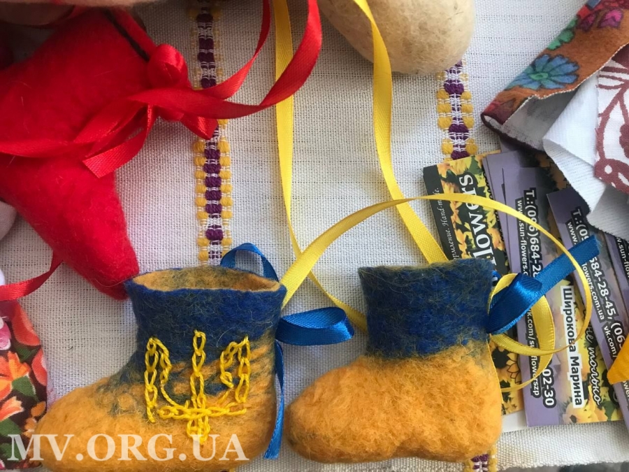 Марина Широкова, яка практикує усвідомлене рукоділля, на виставці представила яскраві віночки та валяночки. А ще Марина принесла цілий пакет жовто-блакитних янголяток, яких лідерка “Запорозьких Берегинь” Олена Шевчук роздавала маленьким відвідувачам виставки.