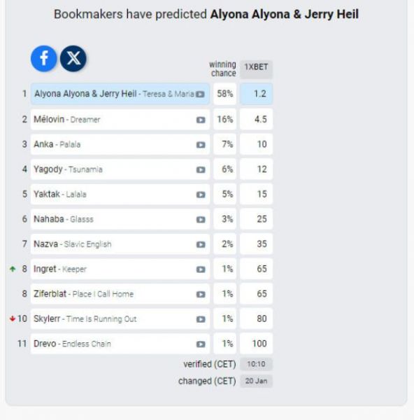 Букмекери пророкують перемогу з ймовірністю в 58 відсотків alyona alyona та Jerry Heil. А от на другому місці, на їхню думку, має опинитися співак Melovin. Трійку лідерів у букмекерських прогнозах закриває співачка ANKA.