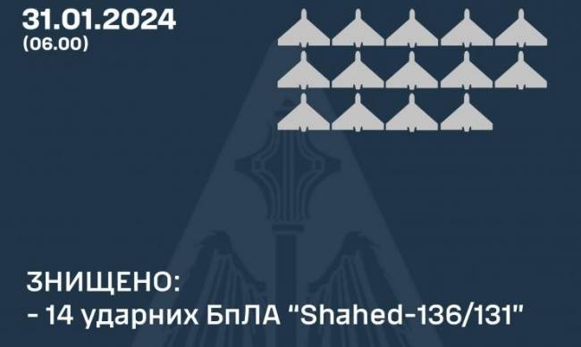 Силами та засобами Повітряних Сил, у взаємодії з ППО Сил оборони України, знищено 14 ворожих БпЛА у межах Миколаївської, Запорізької, Дніпропетровської, Кіровоградської та Харківської областей.