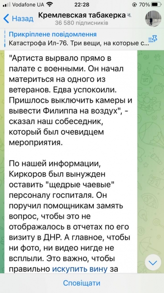 По нашей информации, Киркоров был вынужден оставить "щедрые чаевые" персоналу госпиталя. Он поручил помощникам замять вопрос, чтобы это не отображалось в отчетах по его визиту в ДНР. А главное, чтобы ни фото, ни видео нигде не всплыли. Это важно, чтобы правильно искупить вину за участие в «голой вечеринке» Ивлеевой», - говорится в сообщении.