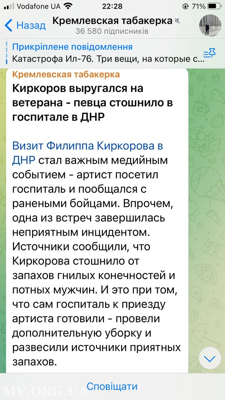 «Источники сообщили, что Киркорова стошнило от запахов гнилых конечностей и потных мужчин. И это при том, что сам госпиталь к приезду артиста готовили - провели дополнительную уборку и развесили источники приятных запахов.