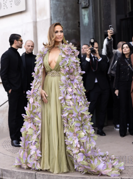 А от 54-річна співачка Дженніфер Лопес віддала перевагу фісташковим відтінкам, які теж є трендами кольорів у майбутньому сезоні. Цього року на тижні моди в Парижі її образ доповнювала довга квіткова накидка наче справжній символ весни.
