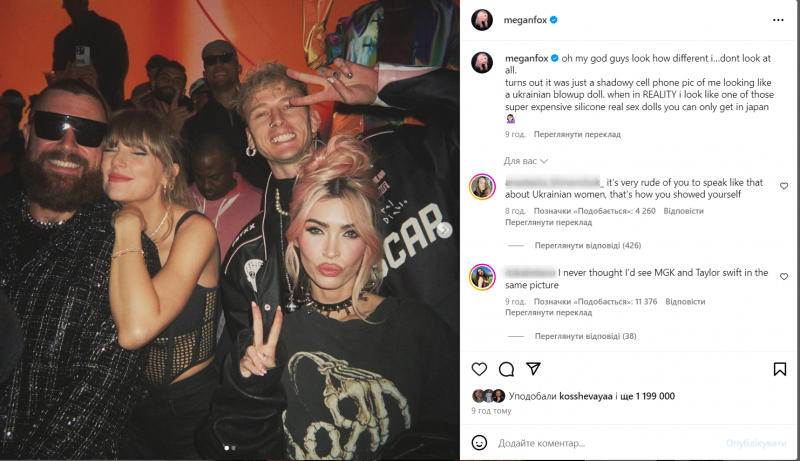 Своєю чергою, Меган Фокс залишила пост у якому, на її думку, "дотепно пожартувала" і порівняла себе з "надувною українською лялькою":