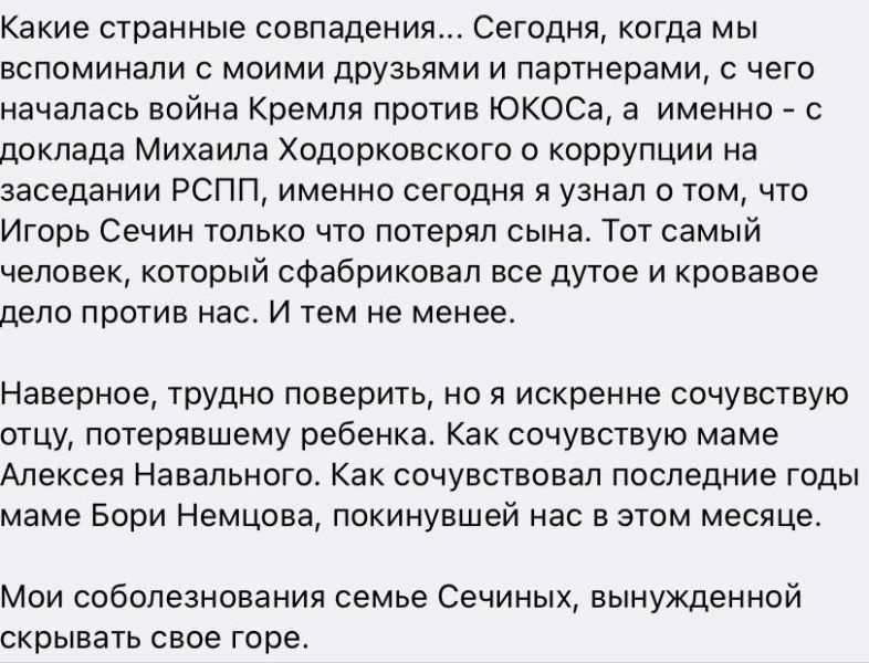 Об этом 19 февраля сообщил один из бывших руководителей нефтяной компании ЮКОС Леонид Невзлин со ссылкой на запись в реестре наследственных дел. Именно Ивану Сечину был «передан» когда-то отобранный у Михаила Ходорковского ЮКОС.