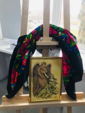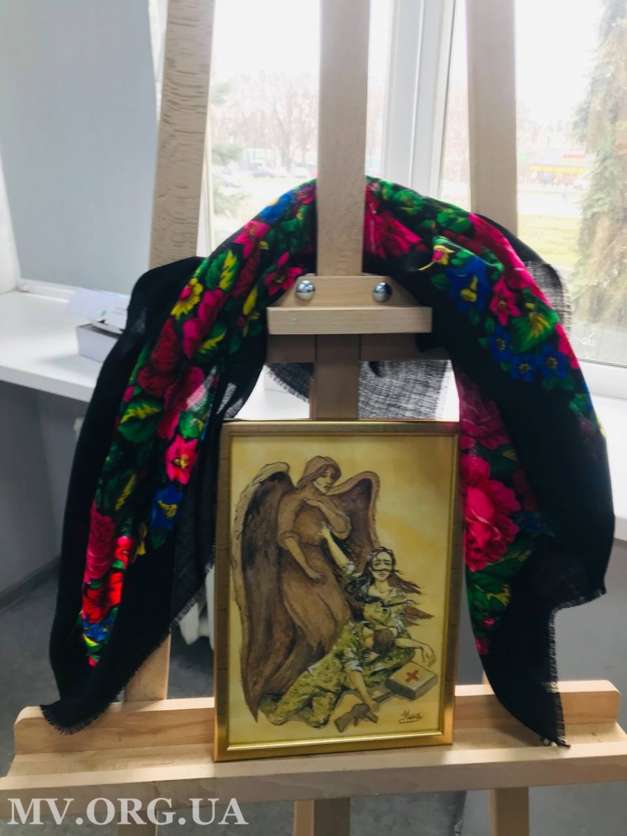 Ще одна картина — про те, як медсестра не дає Смерті забрати воїна. Третя робота називається “Алтар любові”, вона авторства Калинки, військовослужбовиці з полку “Азов”.
