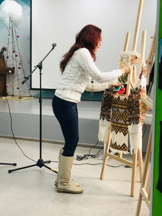 Організатори влаштували і міні-вернісаж з трьох дуже важливих за змістом картин. Зокрема, Маріанна Смбатян зобразила українку, яка тягнеться до шматка скла, щоб ним вдарити гвалтівника з Росії.