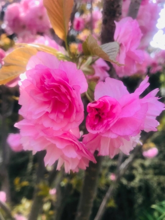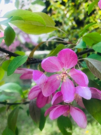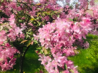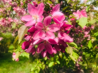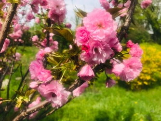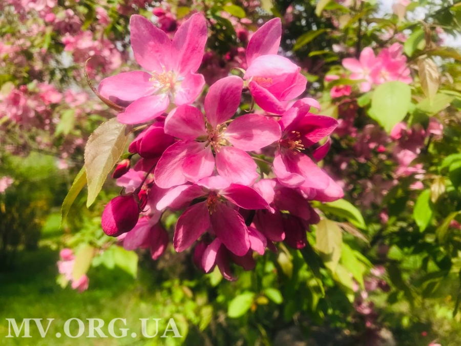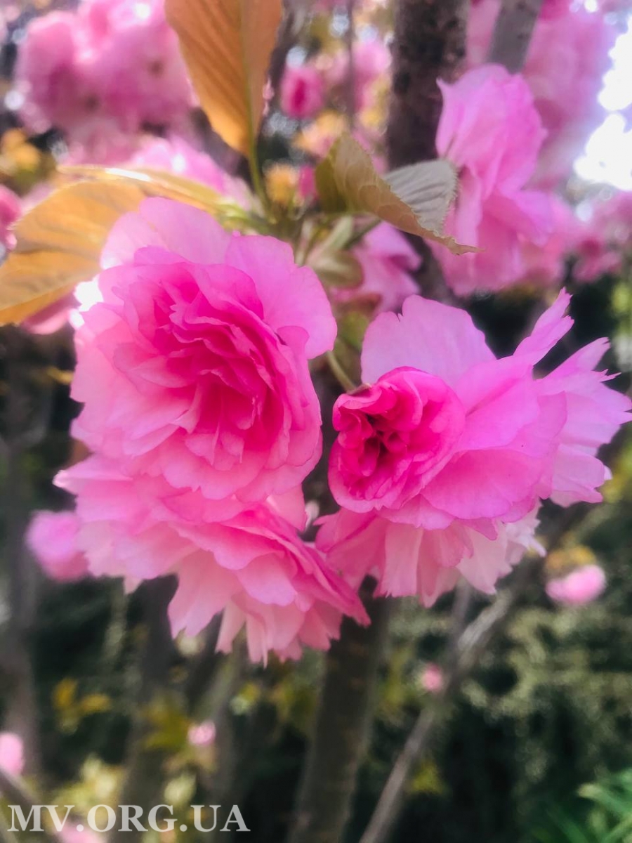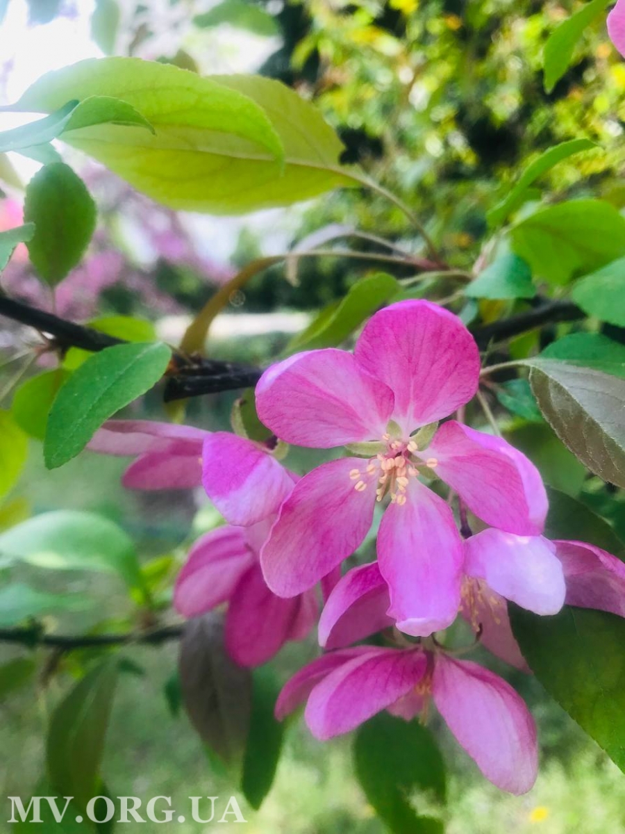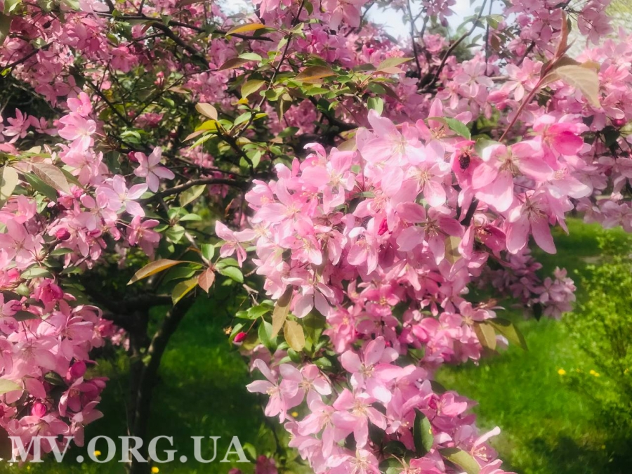 Територія дитячої залізниці милує око у будь-яку пору року. Але особливо гарна вона, звичайно, весною. Зараз переважає рожевий колір магнолій та сакур, а ще — яблунь Недзвецького, кораловим цвітом покрита японська айва, жовтим - форзиція.