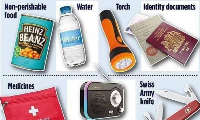 В аварійний чемодан британця входить: вода, консерви, ліки, документи, ліхтарик, радіо на батарейках і швейцарський ніж.