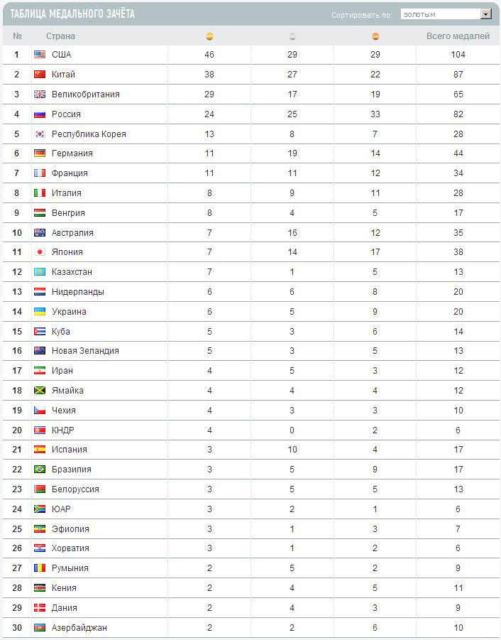 Второе место заняла команда Китая с 87 наградами (38, 27, 22). На третьем месте финишировали хозяева Игр - британцы - с 65 медалями (29, 17, 19). Россияне заняли четвертое место с 82 наградами (24, 45, 33). Пятерку замкнула Южная Корея (28 - 13, 8, 7).