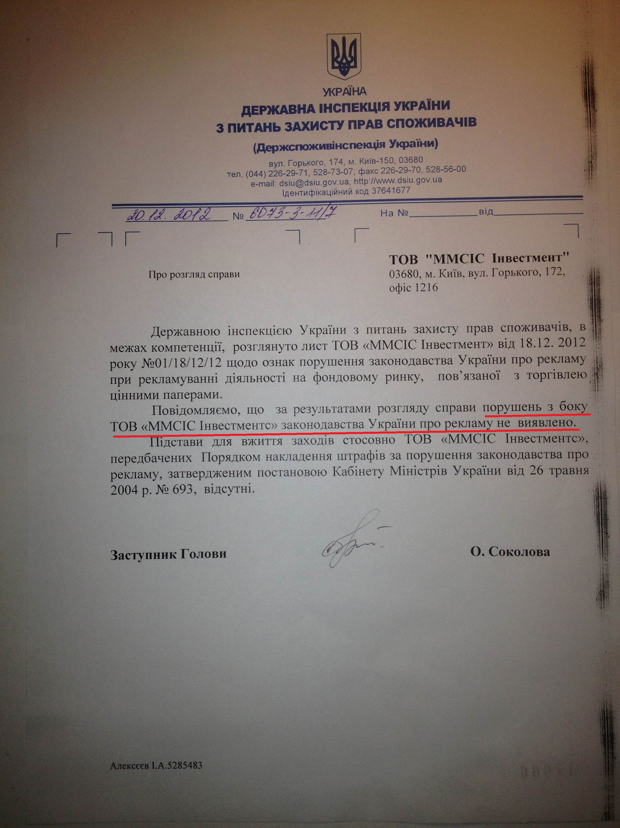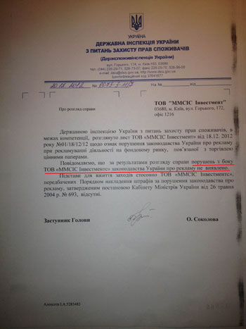 Инспекция указала на то, что «повод для применения мер касаемо "ММСИС ИНВЕСТМЕНТС", предусмотренных Порядком наложения штрафов за нарушение законодательства о рекламе, утвержденным указом Кабинета министров Украины от 26 мая 2004 г. № 693, отсутствует».