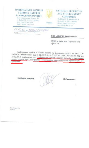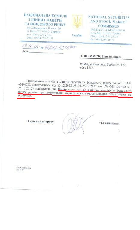Что касается действий АУФТ, то здесь все точки над «і» расставила Национальная комиссия по ценным бумагам и фондовому рынку — государственный орган, регулирующий все вопросы, связанные с фондовым рынком Украины и торговлей ценными бумагами, которая в своем ответе на запрос "ММСИС ИНВЕСТМЕНТС" сообщила, что не принимала никаких решений по делегированию полномочий саморегулирующимся организациям, к которым относится АУФТ: