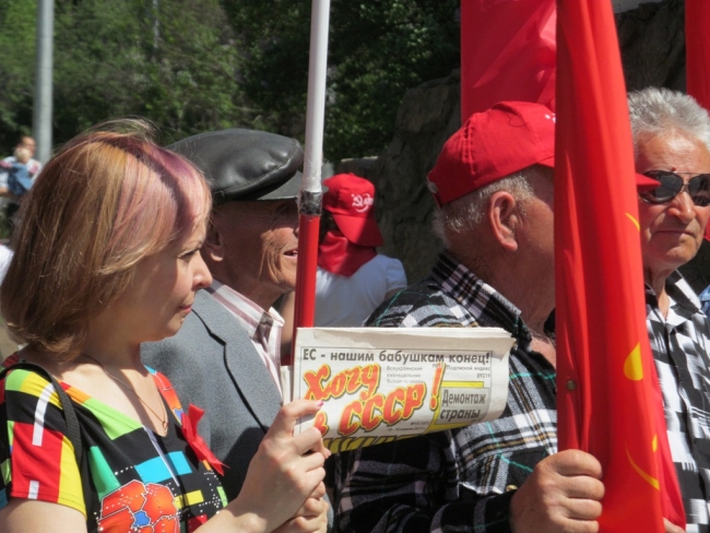 Мимо борда с призывом бороться за мир, труд и май (любопытно – с кем бороться?) демонстранты пронесли плакаты, флаги, таблички с символикой партии и лозунгами «Вернем страну народу», «Не позволим лишить нас прав, данных Октябрем» и др.