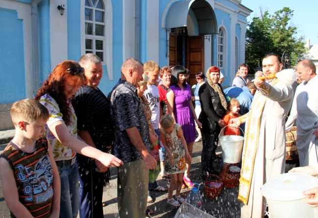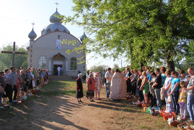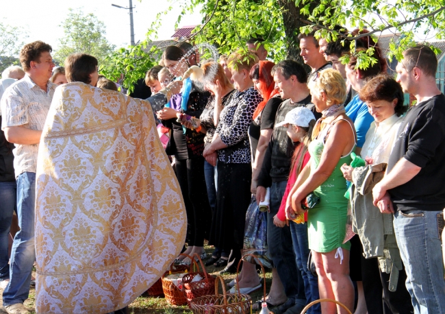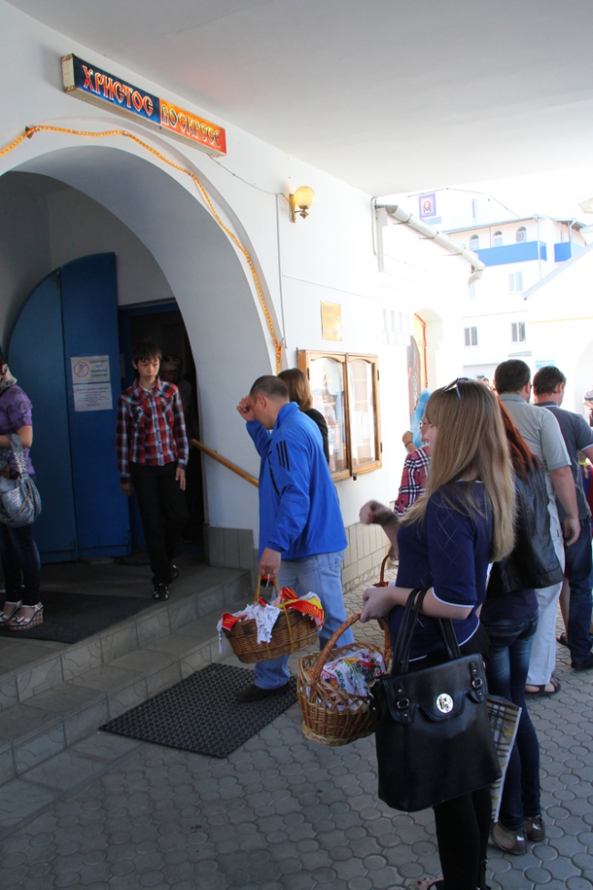 Во всех православных храмах Мелитополя прошли ночные богослужения, а после службы началось освящение куличей, пасок и прочей снеди. С пасхальными приветствиями «Христос воскресе!» священнослужители обходят толпы горожан и щедро окропляют их и принесенные пасхальные корзинки святой водой. В храме св. Андрея Первозванного УПЦ КП одна из прихожанок любезно согласилась ознакомить нас с содержанием своей корзинки, нарядно украшенной вышитым собственными руками рушником. По словам Галины Дмитриевны, на освящение она традиционно приносит куличи, крашеные яйца, колбаску, мясо, овощи, фрукты и вино – не водку и другие крепкие горячительные напитки, а именно вино. В общем, все то, что придя домой, поставит на праздничный стол для разговения. Кроме еды, прихожане освящают воду.