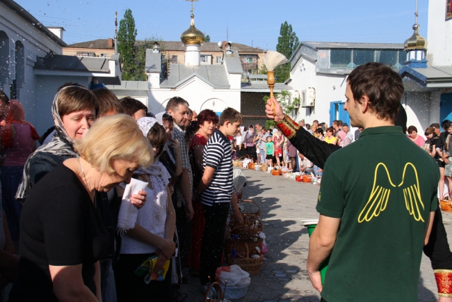 Кипит людское море в монастыре преп. Саввы Освященного УПЦ МП. Вся улица Воровского на подъездах к монастырю запружена авто. Мелитопольцы идут в монастырский двор нескончаемым потоком. Одни заходят в церковь, молятся, ставят свечи и святят пасхальные угощения, другие довольствуются лишь процедурой освящения содержимого пасхальных корзин. Как сообщил один из служителей, освящение здесь будет проводиться до 18.00.
