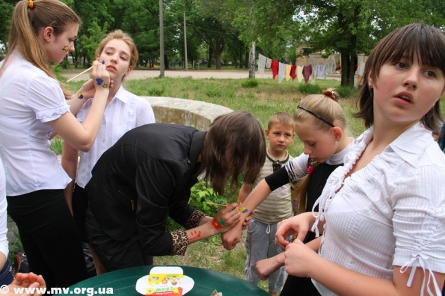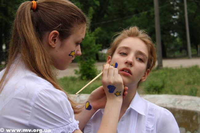 По словам художественного руководителя Дворца культуры железнодорожников Евгения Топалова, каждую третью субботу мая в Украине отмечается День Европы. Накануне этой даты впервые творческий коллектив ДКЖ решил провести интерактивное мероприятие с участием школьников разных возрастов из ООШ-20, гимназии-19 и СШ-23. Передвигаясь от столика к столику, от выставке к выставке, ребята увидели работы воспитанников студии декоративно-прикладного искусства ДКЖ (рук. Инна Вишневая-Ильина), мастериц из общества "Надежда" Надежды Денисюк, Анны Мирошниченко, Нины Стойчевой, Натальи Назаренко и Людмилы Долговой, а также фото Александры Кархут "Жизнь в объективе". Кроме того, большой популярностью пользовалась мини-студия помощников сотрудников ДКЖ, которые рисовали флаги Украины и европейских стран на руках и щеках ребят.