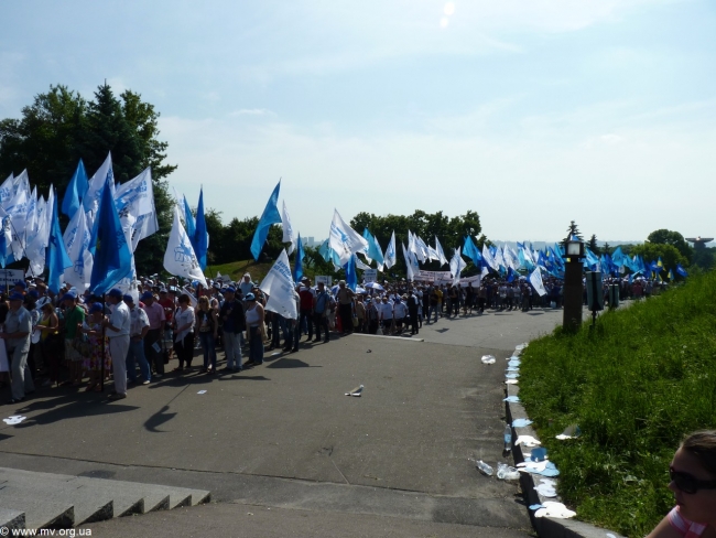 Но, несмотря на массовость, чувствовалась беспорядочность всего происходящего. Часть людей находилась конкретно на площади у монумента-скульптуры «Родина-мать», остальные группы – за пределами мемориала. В итоге, вся поддержка «Партии регионов» растянулась до станции метро "Арсенальная".