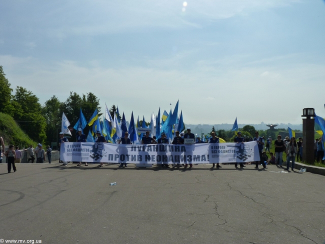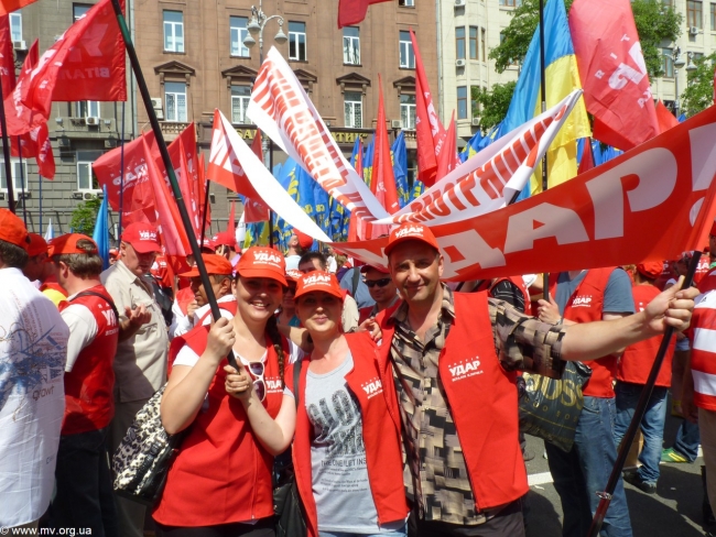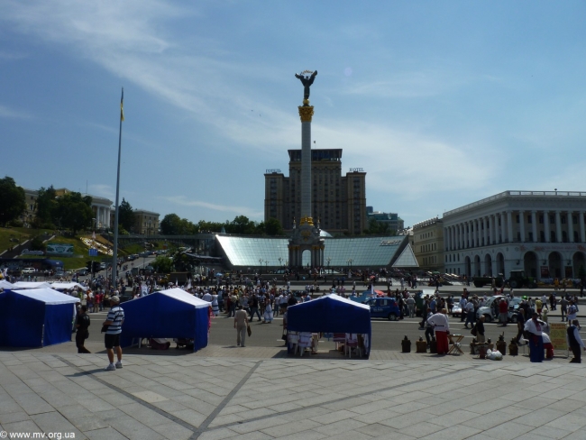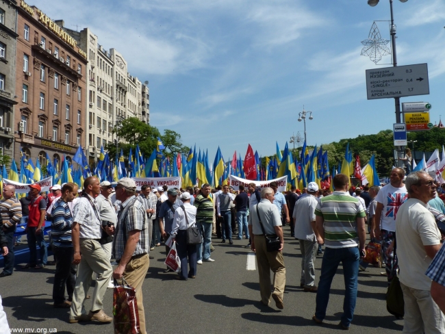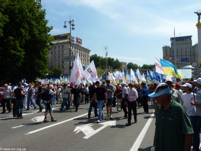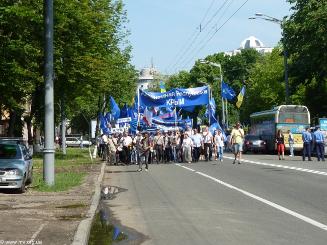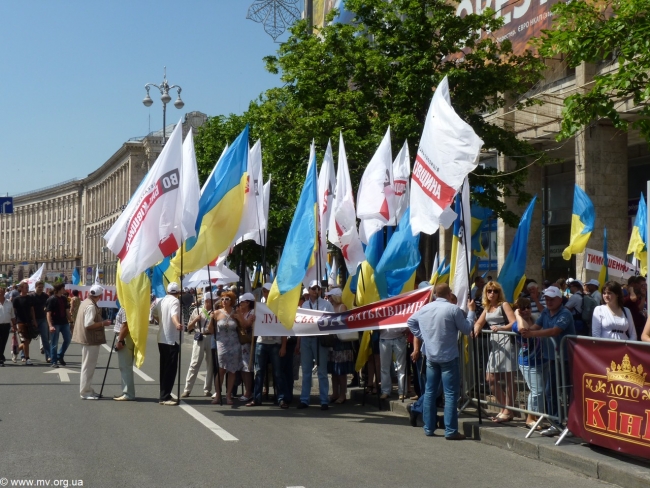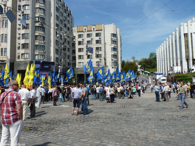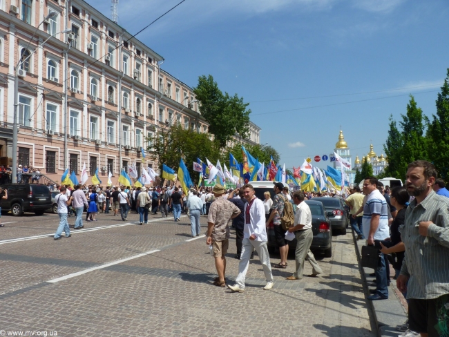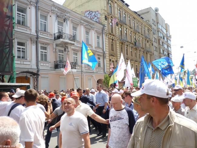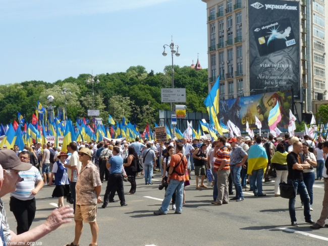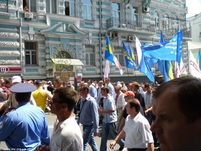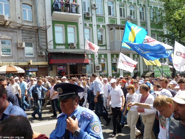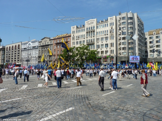 По улице маршировали колонны людей из разных областей, распевая песни или выкрикивая речевки. Видимо, они ждали команды свыше, чтобы выдвинуться на Европейскую площадь, где в это время собрались сторонники оппозиции. Мелитопольские «регионалы» в акции участвовали, мы связывались с ними по телефону, но, к сожалению, нам не удалось с ними встретиться.