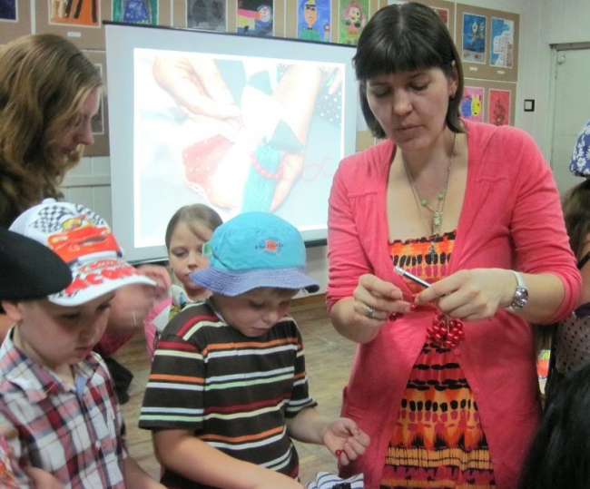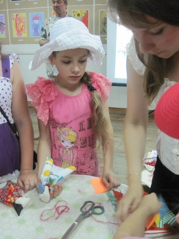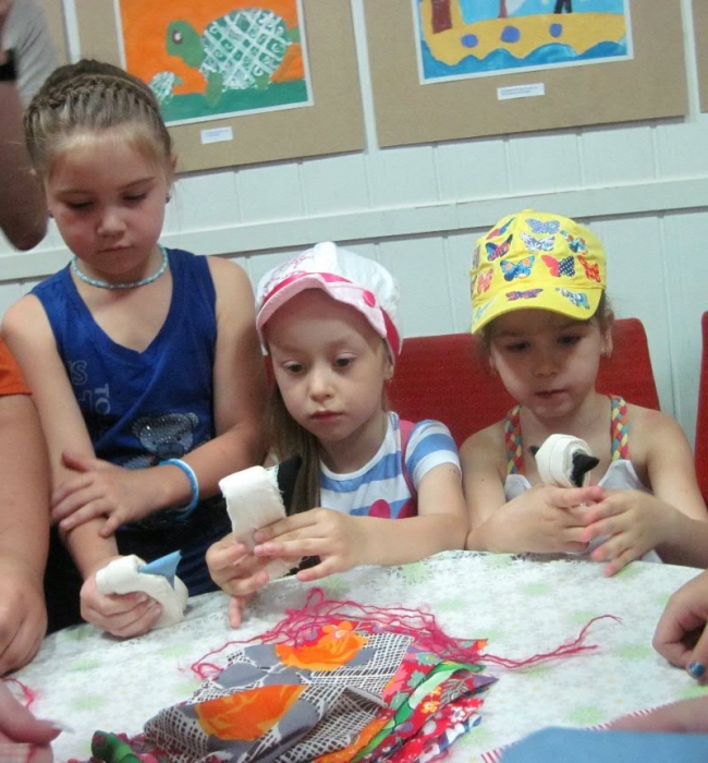 После небольшой экскурсии по выставке для воспитанников Дворца творчества Елена Ташевская (Студия искусств и ремесел «Колесо времени) провела мастер-класс по изготовлению игрушки «Карлуши». Мальчишки и девчонки собрались за столиками, где уже лежали подготовленные для рукоделия разноцветные лоскутки ткани. Дети с увлечением принялись мастерить и украшать игрушки. Никто из ребят не остался без внимания, каждый получил в подарок по «Карлуше».