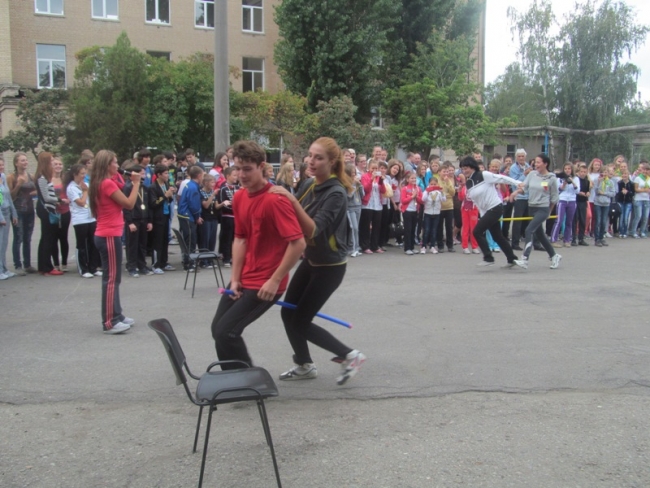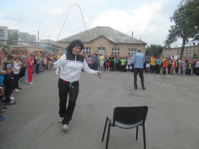 В учебных заведениях Мелитополя с самого утра в различных эстафетах и состязаниях соревновались не только школьники разных возрастов, но и их учителя, как, например, в гимназии-5.