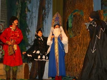 - Для малышей это новая работа, мы ее еще ни разу не ставили, - отметил режиссер молодежного народного театра «Время» Борис Туменко. - Готовили ее артисты «Времени» и подросткового народного театра «Колесо». Им помогали малыши из «Балаганчика» (гимназия № 9) и представители студенческого театра-студии МГПУ «Гаудеамус». Среди начинающих артистов есть те, для кого спектакль - дебют. Так, Юлия Попович из ООШ № 1 занимается актерским мастерством всего два месяца. Ей досталась роль Ворона Вороновича - помощника Кощея Бессмертного, с которой она справилась на ура. Гульназ Кузьмина - студентка, но для нее «Лукоморье» также дебют, до этого ей приходилось участвовать лишь в «массовках». Загримированную в заморское чудище и скрытую костюмом девушку в пьесе узнать невозможно, но главное - участие, сама атмосфера.