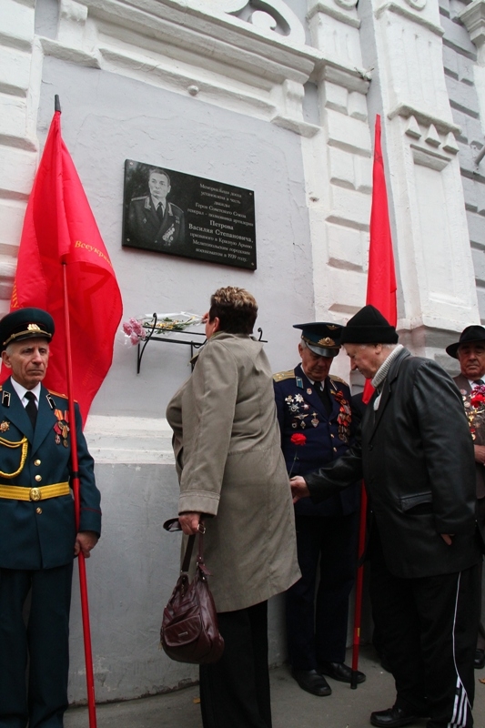 Мемориальная доска генералу-полковнику В. Петрову появилась благодаря инициативе "Союза краеведов Мелитопольщины", городского совета ветеранов войны и труда и при поддержке горисполкома. На церемонии торжественного открытия мемориальной доски Герою присутствовали представители городского и областного руководства, депутаты разных уровней, ветераны Великой Отечественной войны, школьники и гости города. Но особенно трогательным этот день стал для племянницы Василия Степановича и нашей землячки Веры Степановны Прихненко, которая рассказала, что в ее семье дядя - пример поведения, силы духа, целеустремленности и мужества. "Василий Степанович - человечище, ему с детства прочили великую, но трудную судьбу, так и случилось", - сказала Вера Степановна.