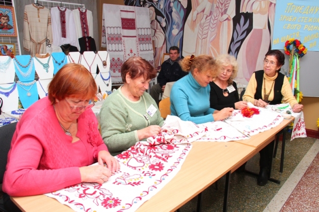 Мастерицы из "Надежды" под руководством Заслуженного мастера народного творчества Украины, члена Национального союза мастеров народного искусства Украины Надежды Денисюк вышивали шестиметровый рушник - оберег Мелитополя. Здесь же свои ювелирные по технике исполнения разнообразнейшие украшения из дерева, косточек, изделия со вставками из самоцветов и камней Сваровски демонстрировала член общества "Надежда" Наталия Назаренко. У столика крымских татар было весело и шумно: здесь вам и песенку споют на родном языке, и литературу об обществе покажут.