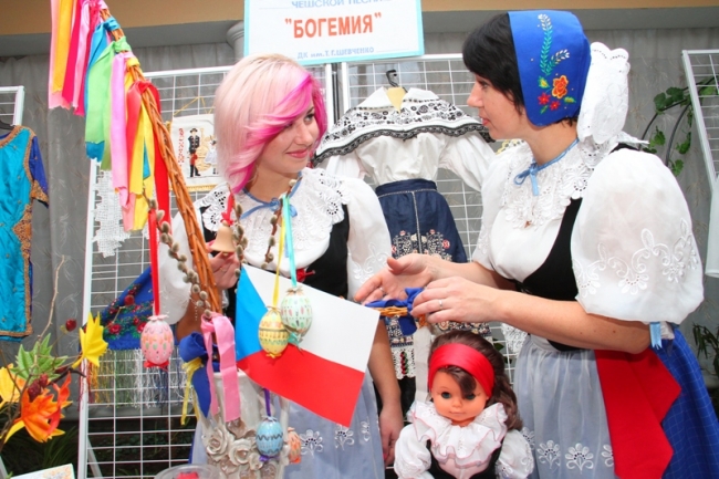На стенде чешского общества "Богемия" привлек внимание старинный национальный костюм 19-конца 20-го века. Как рассказали члены общества, бывший председатель чешского общества Вера Дворжек переехала с семьей в Чехию в г. Либерец. Разбирая старые вещи на чердаке дома, она обнаружила этот уникальный костюм и прислала его в мелитопольское чешское общество: неимоверной красоты кружево ручной работы, вышивка, бисер и пайетки.