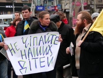 «Не чіпайте наших дітей!», «Банду геть!», «Ми за цивілізовану Україну!», «Януковича и его банду в отставку!» - с такими плакатами стоят митингующие. А еще с флагами Евросоюза, национальными флагами и двумя красно-черными флагами одной из националистических партий. Организаторы мероприятия – представители оппозиционных партий, подчеркивали, что это – мирный митинг, и просили не поддаваться на провокации. Со стороны милиции, следящей за порядком поодаль и фиксирующей все происходящее на видеокамеру, провокаций нет. А вот некоторые представители левых сил, групкой из десятка человек с плакатом «Нет рецептам МВФ!» стоящих недалеко, иногда затевают дискуссии.