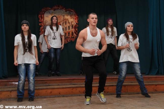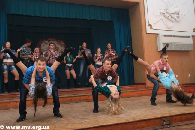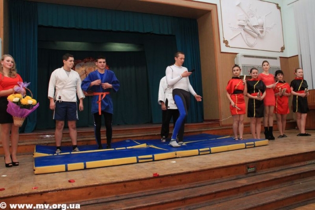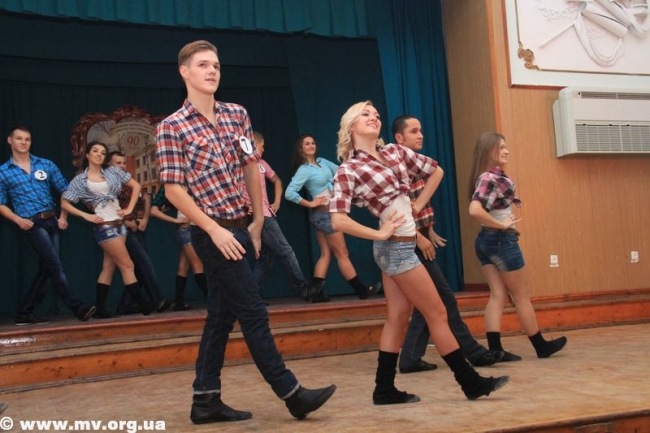 Первый раз на сцене ребята появились в обычных джинсах и кожаных курточках-пиджачках – такие себе городские мачо. Пока парни дефилировали по сцене, ведущие знакомили зал с их талантами, увлечениями, принципами и планами на будущее. После выхода в деловых костюмах участникам пришлось немного поволноваться, так как наступило время интеллектуального конкурса с непростыми вопросами от ведущего. Так, парням приходилось на ходу выдумывать причины того, почему девушка должна уметь готовить борщ, решать, летают ли в животе у бабочек люди, когда они влюбляются и определять название для детенышей леопарда. И, надо отдать должно студентам, испытание это они выдержали с честью.