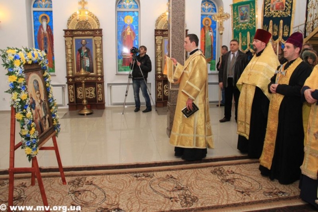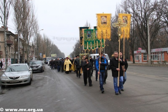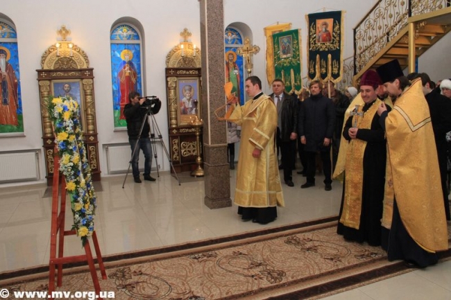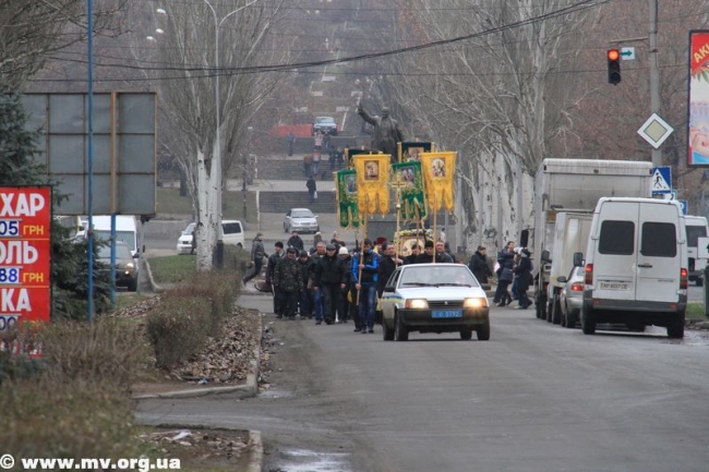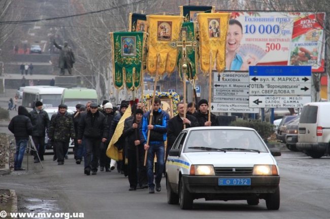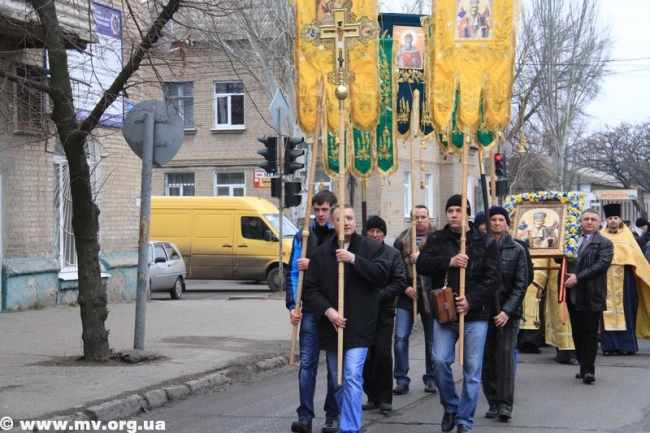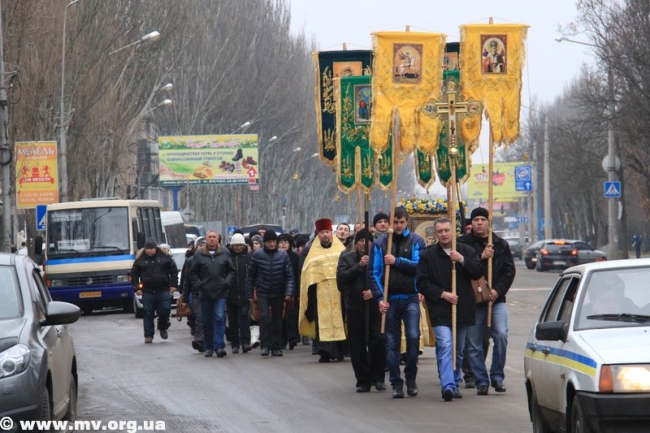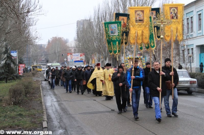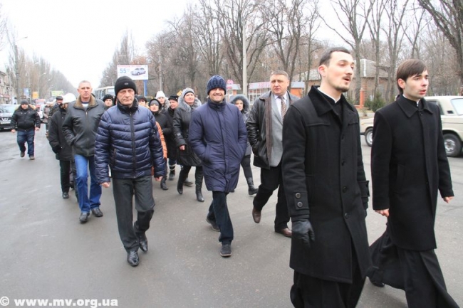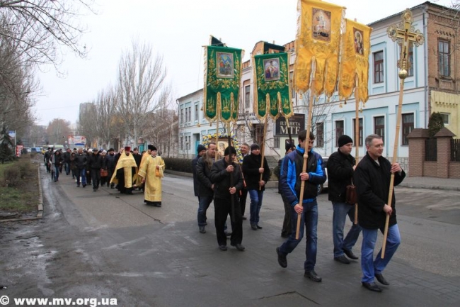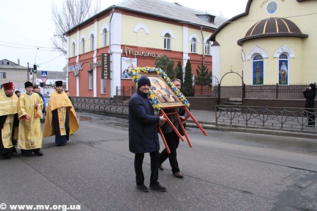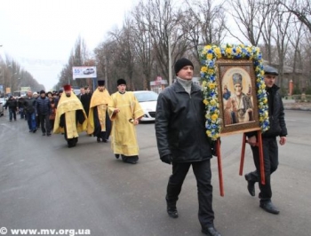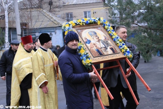 С этой иконой, хоругвями под церковное пение колонна верующих прошла по проспекту Б. Хмельницкого от храма св. Андрея Первозванного до храма св. равноапостольных Кирилла и Мефодия УПЦ КП. В храме св. Кирилла и Мефодия (к слову, восстановленному благодаря инициативам и поддержке Е. Куценко и Олега Буряка) священнослужители во главе с настоятелями храмов о. Игорем (Марковичем) и о. Валерием (Колесником) провели торжественное богослужение, в ходе которого славили Иисуса Христа, святого Чудотворца Николая и помолись о реализации планов о восстановлении кафедрального собора на площади Революции (бывшей Базарной) на историческом месте.