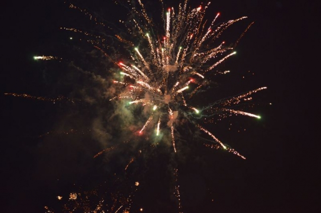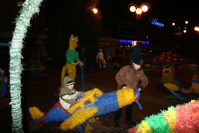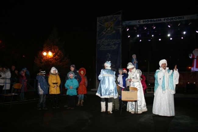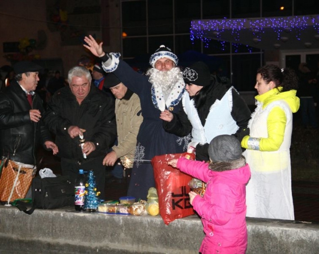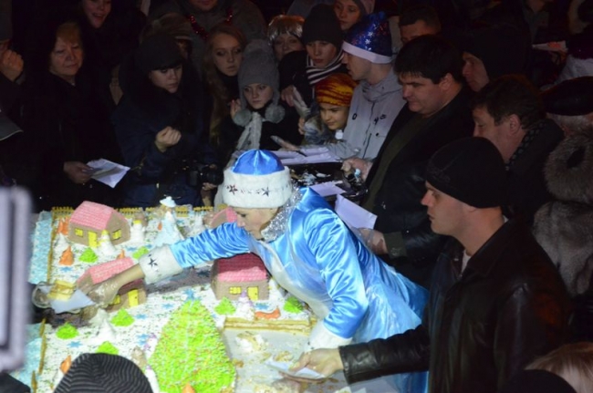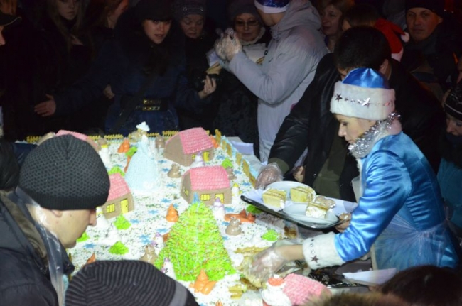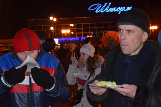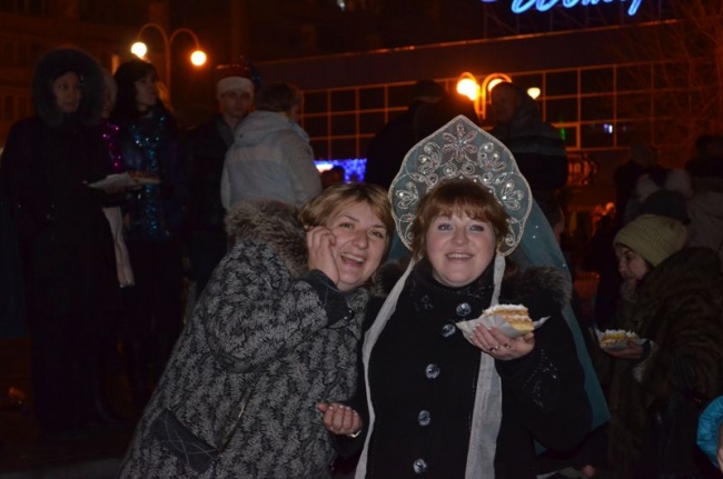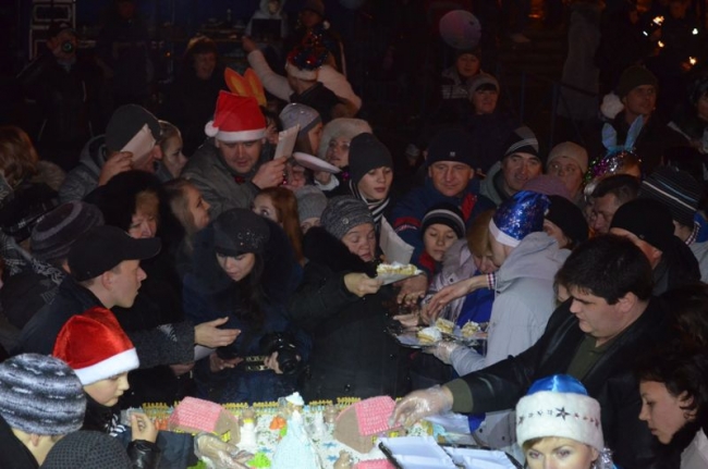 Под бой курантов поднимали бокалы, обнимались, целовались, запускали салют. Как по заказу, небо порадовало легким снежком – мелочь, а приятно. Салют получился знатным: к принесенной горожанами пиротехнике присоединился праздничный залп от организаторов мероприятия, появившийся из-за ДК Шевченко. В этот момент начали раздавать 2014 кусков новогоднего 150-килограмового торта. Тут не обошлось без традиционной толчеи и давки. В итоге сладкое лакомство отнесли в фойе ДК – во избежание травматизма. Неподалеку угощали и горячим травно-медовым чаем от спонсоров. Кроме того, работал детский луна-парк и фотопарк, продавали различные сувениры, игрушки и веселые головные уборы.