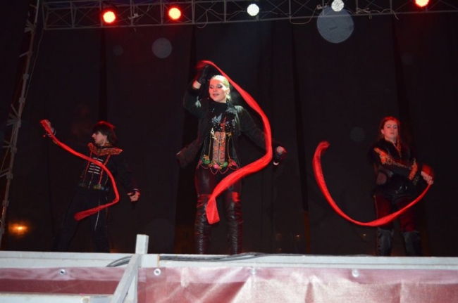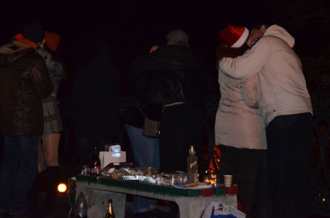 Эстафету выступления подхватила столичная группа «Made in Ukraine», выступившая с каверами украинских народных песен. Они не были новогодними, но уже веселым отдыхающим пришлись по душе. Лавочки и фонтан стали импровизированными столами (кое-кто подготовился заранее и принес свой раскладной стол), а место рядом со сценой – танцполом (особо активные танцоры даже свалили часть ограды).
