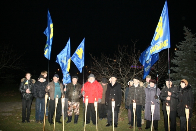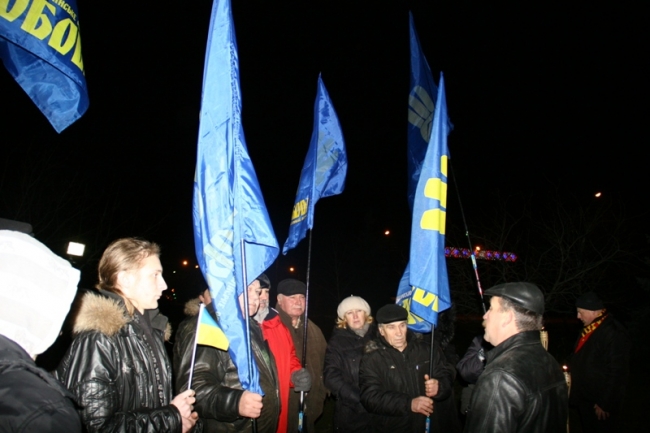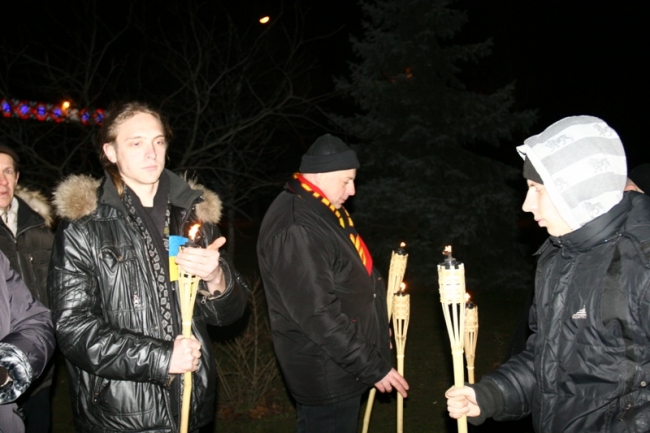 Около двадцати активистов собрались около памятника Б.Хмельницкому и зажгли факелы. С речью выступил руководитель городской организации Алексей Ревенок, назвав мероприятие маршем национального сопротивления в знак солидарности с участниками Евромайдана, и их требованиями – отставки правительства и перезагрузки власти.