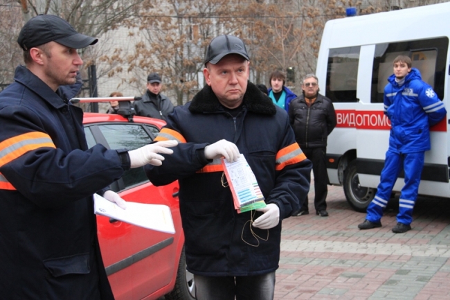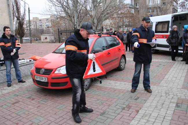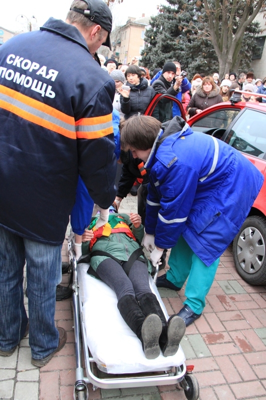 По легенде, жертвами двух столкнувшихся машин стали шесть человек. Четверо из них дошли до машины «скорой» сами, девушка-водитель была в сознании, но в тяжелом состоянии, ее после специальной подготовки перенесли на носилках, а пассажиру, которого выбросило из машины (его роль выполнил манекен), медики «запускали» остановившееся сердце.