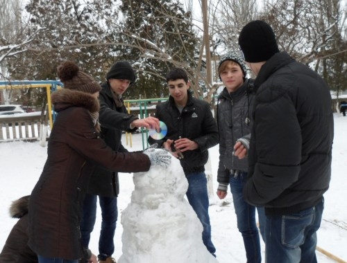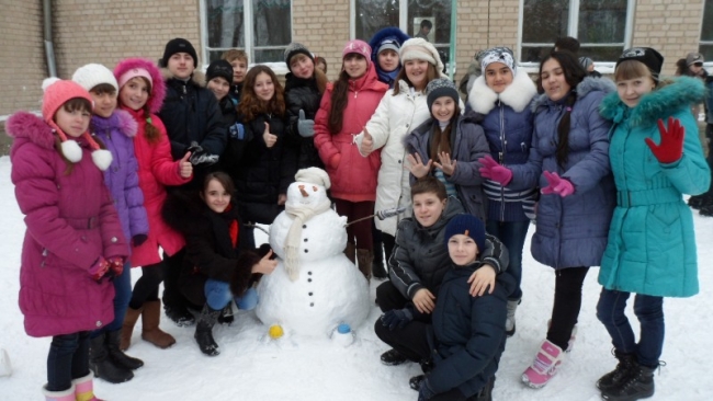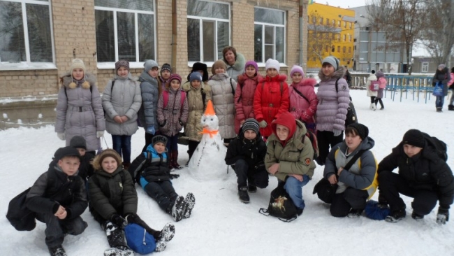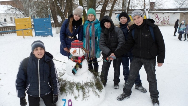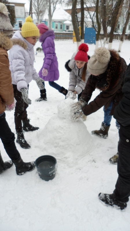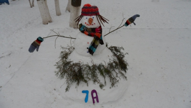 21 января в течение пяти перемен кипела работа. За дело взялись ученики 5-11 классов. Задумки у школьников были грандиозными, но случилось не так, как ожидалось. Снег отказывался лепиться в тугие валики, поэтому детям пришлось хорошенько потрудиться. В ход пошли большие лопаты, которыми ребята сгребали снег и ведра с водой, которыми пришлось поливать фигуры, чтобы придать им форму. Кропотливая работа увенчалась успехом: на школьном дворе поселились восемь снеговиков – в шапках, варежках, шарфах и, даже, юбочках из мишуры.