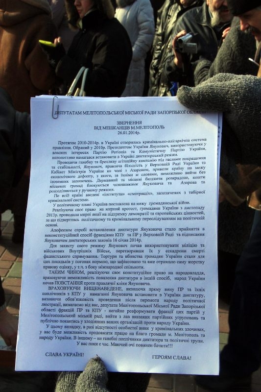Были зачитаны обращения к депутатам Запорожского областного и Мелитопольского городского советов. В них идет речь и о законах, принятых парламентом 16 января и подписанных Президентом 17 января, о том, что «Украина поставлена на грань гражданской войны» и о других последних событиях. Оппозиционеры требуют расформировать фракции Партии регионов и КПУ.