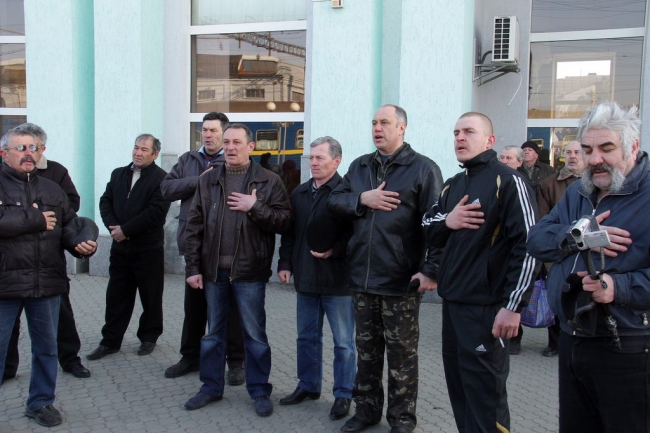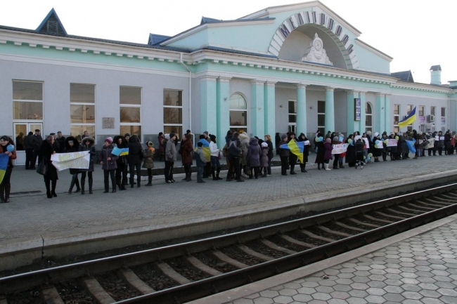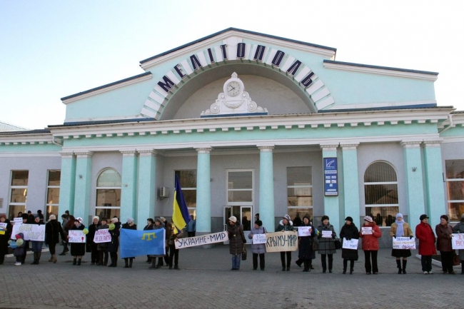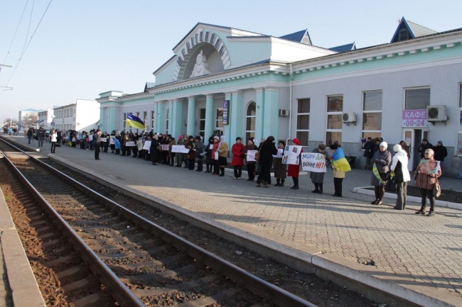 Утром 8 марта на перроне железнодорожного вокзала собралось около ста женщин разных национальностей. Выйти в свой праздник на мирную акцию женщин заставила неспокойная ситуация в Крыму. Матери Мелитополя взяли с собой и своих детей.