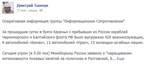 «За прошедшие сутки в бухте Казачья с прибывших из России кораблей Черноморского и Балтийского флота РФ было выгружено 420 военнослужащих, 9 автомобилей Камаз, 13 автомобилей Урал, 15 командно-штабных машин», - написал он.