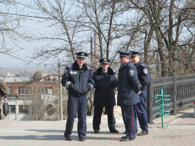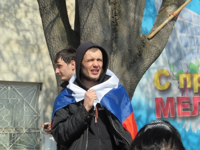 На площадь пришли представители компартии, «Русского блока» и горожане, стремящиеся к союзу с Россией. Чуть поодаль стояли молчаливые молодые люди из «Самообороны Мелитополя». Что-либо говорить парни отказались наотрез.