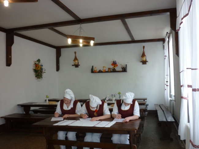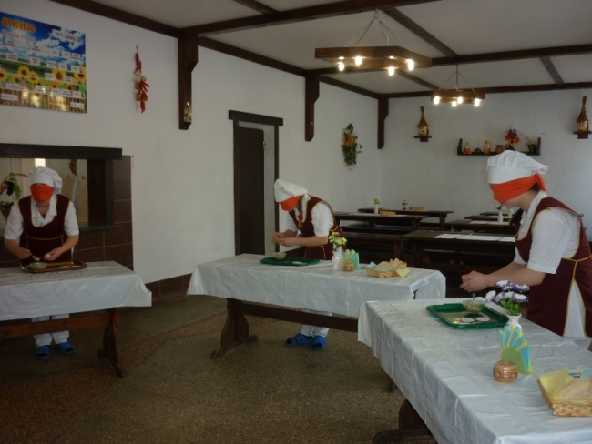 Участницы отвечали на теоретические вопросы и конечно же решали практические задачи. Например, взбивали белковый крем или лепили вареники с закрытыми глазами. Закончилось соревнование презентацией праздничного обеда.