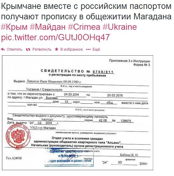 Крымчане, которые решили получить российские паспорта взамен украинских, обнаружили, что зарегистрированы не в Крыму, а в Магадане и Магаданской области, информирует интернет-издание Спротив. "В новых российских паспортах крымчане обнаружили прописку в Магадане", - говорится в сообщении издания в Twitter.