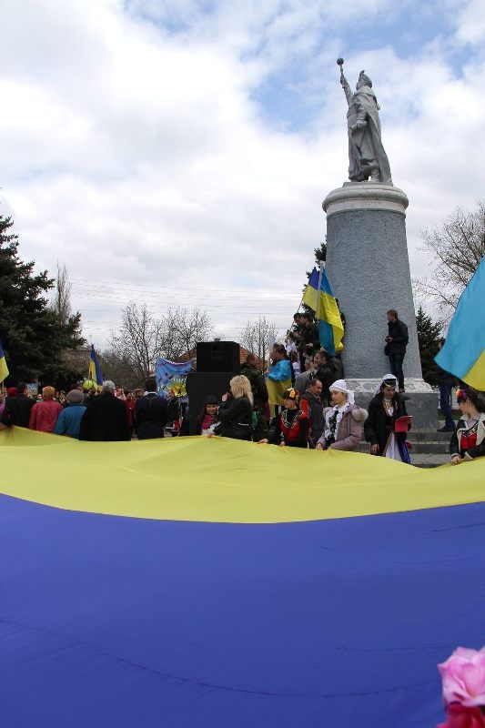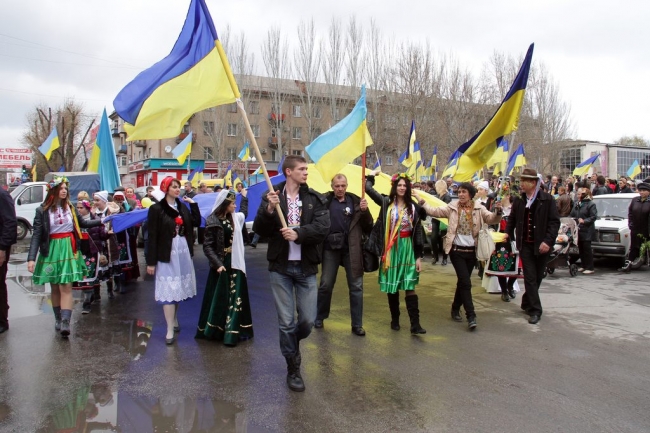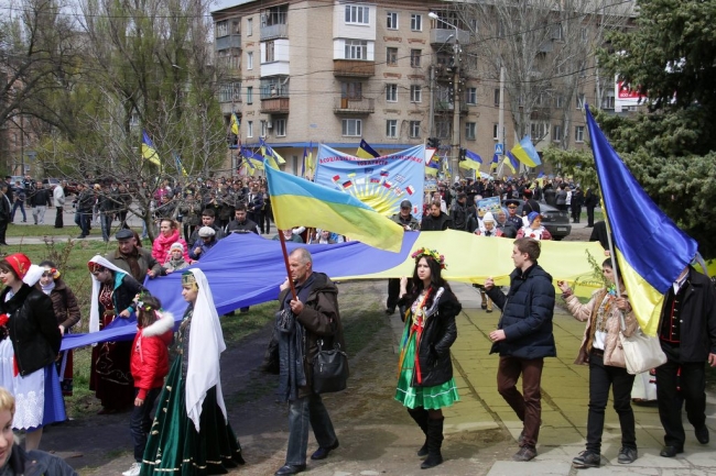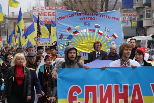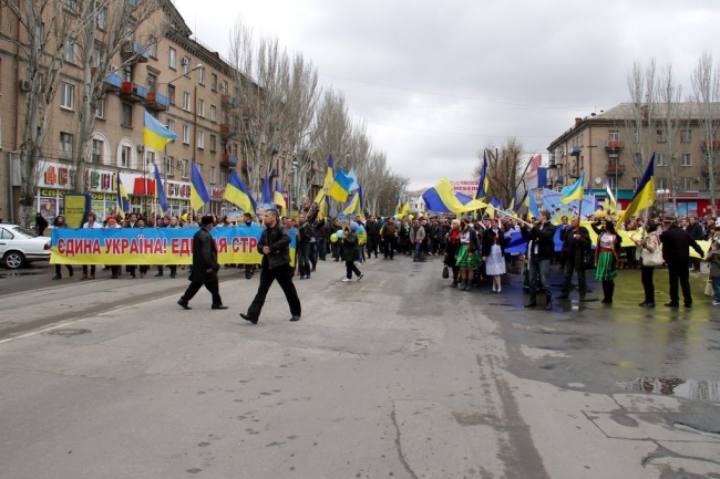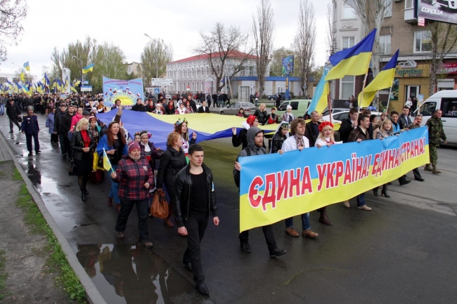 С транспарантом «Единая Украина единая страна» во главе колонны, люди двинулись маршем по центральной улице нашего города к памятнику Богдану Хмельницкому. Представители различных национальных обществ несли огромный флаг Украины, в колонна двигалась под музыку духового оркестра Мелитопольского училища культуры. Сопровождали шествия представители правоохранительных органов и казаки Мелитопольского куреня Войска Запорожского.